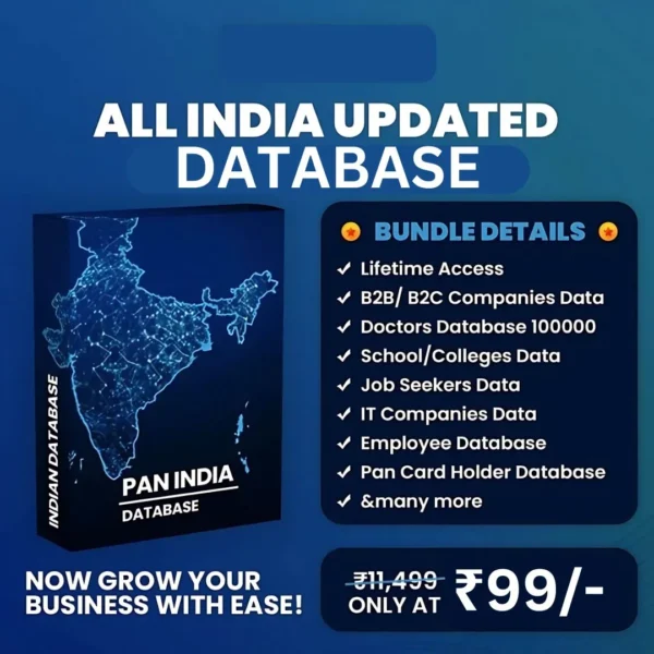 Unlock limitless business opportunities with our 110 Crore+ Pan India Database from 2020-21. This meticulously compiled dataset is your ultimate tool for targeted marketing, customer outreach, and business growth. Whether you’re launching a product, running a campaign, or expanding your network, this database gives you the edge to connect with the right audience, faster.